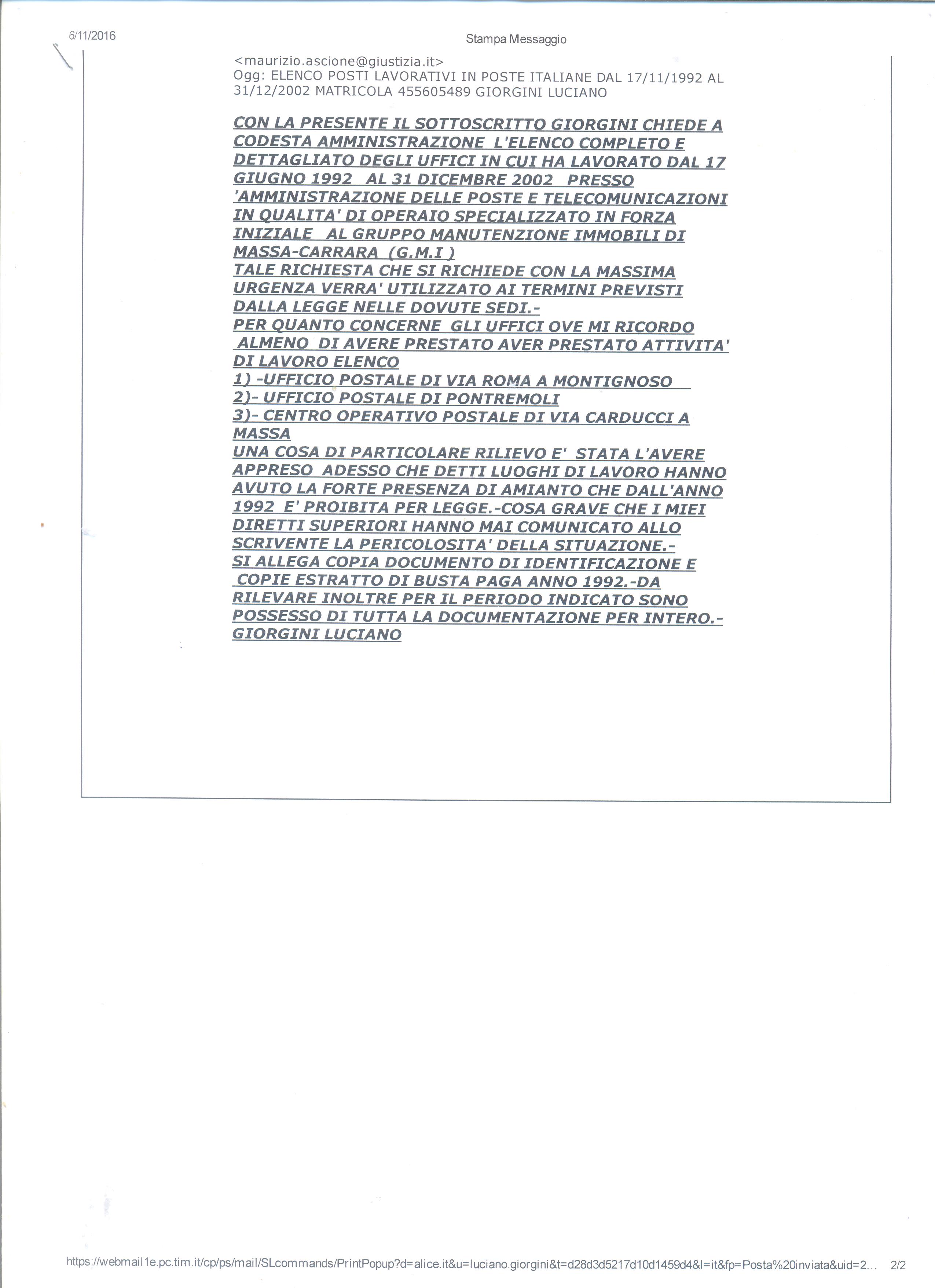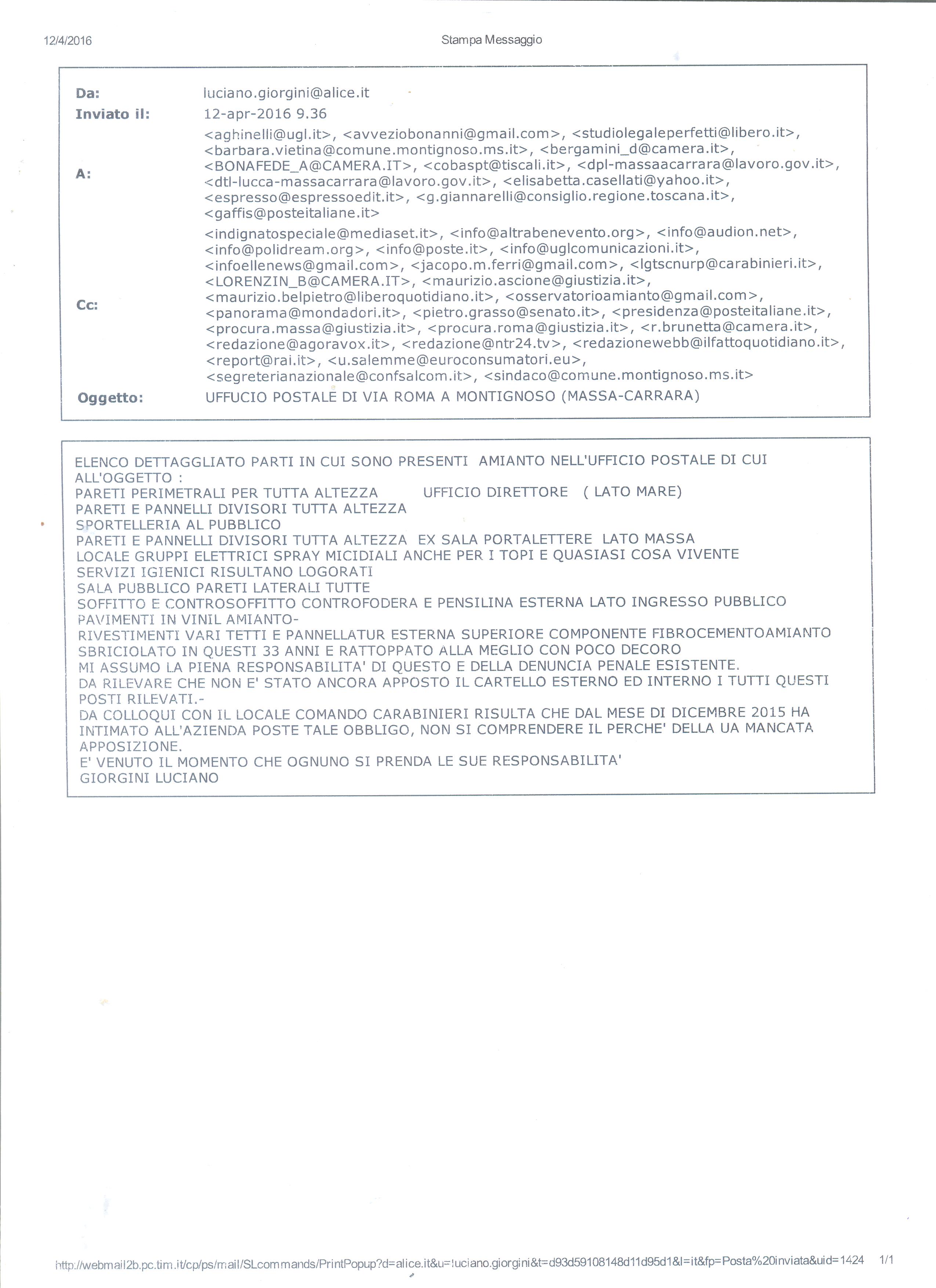 Sede Nazionale: Via Teodosio, 9 - 20131 MILANO Tel/Fax 02-2663474 E-mail:cobaspt@tiscali.it - www.cobasptcub.it C.F. 97116840154 ORDINANZA INSTALLAZIONE CARTELLO PRESENZA AMIANTO DIENTRO E FUORI UFFICIO POSTALE DI VIA ROMA A MONTIGNOSO (MS).